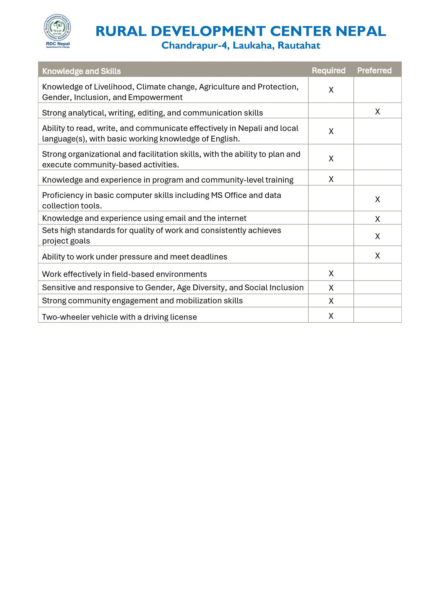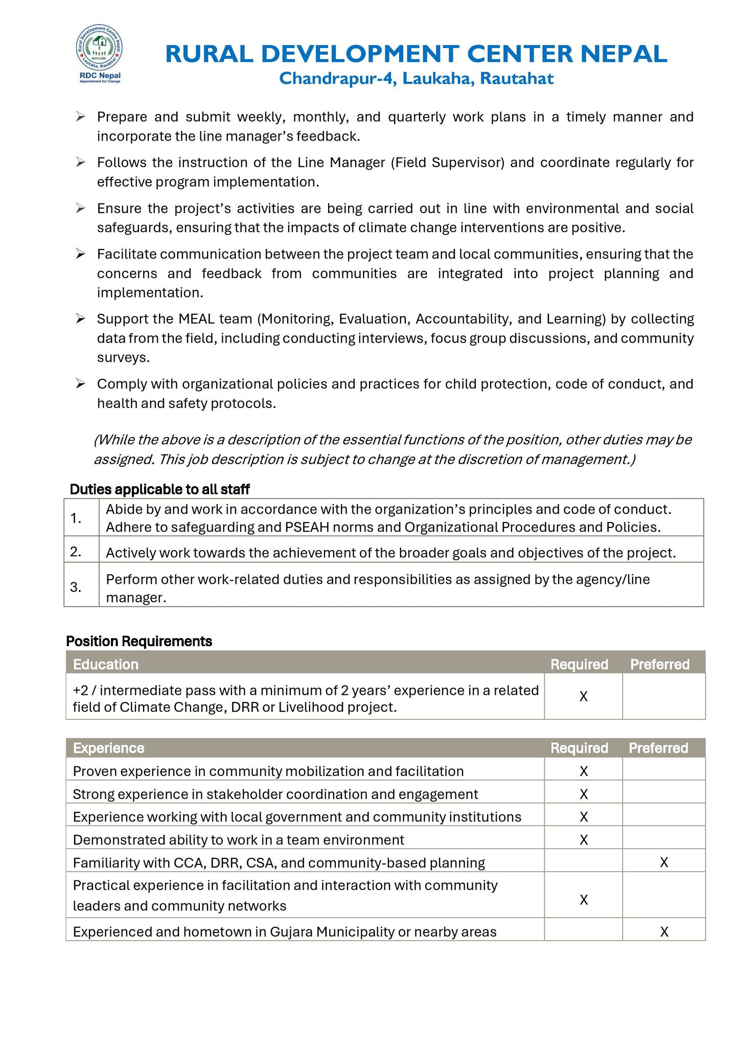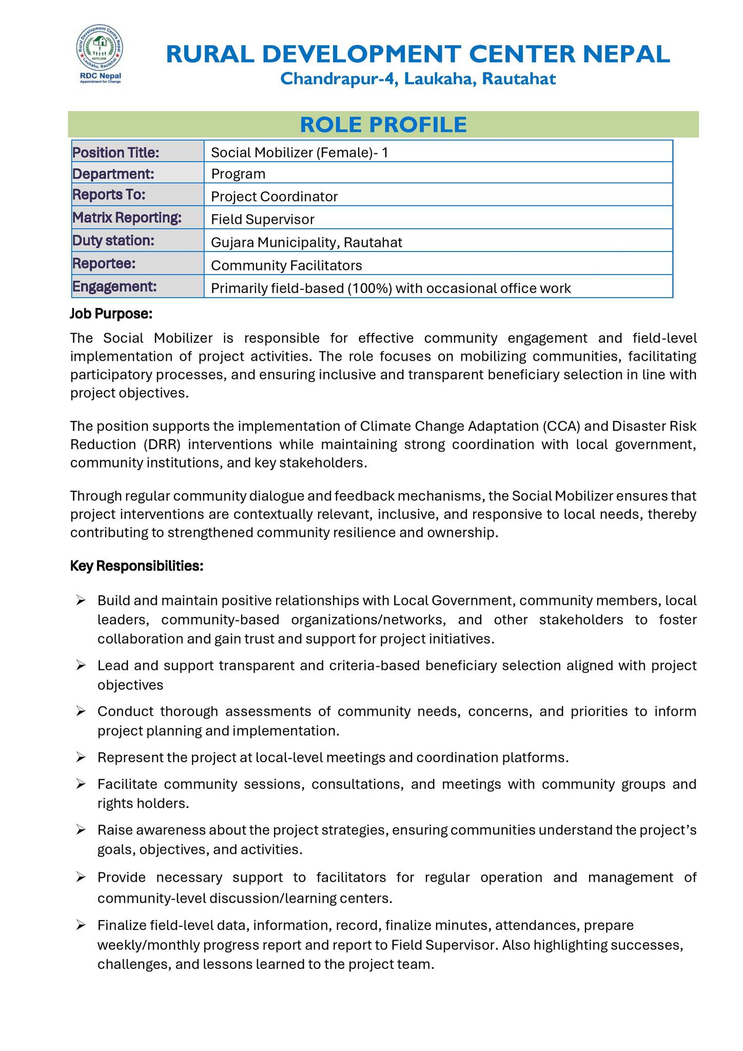 RDC Nepal is looking for a dedicated and motivated Female Social Mobilizer for the BCRC Project funded by OXFAM in Nepal based in Gujara Municipality, Rautahat.